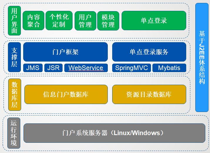 統(tǒng)一門戶框架作為基礎(chǔ)支撐層,提供了門戶建設(shè)、個性化門戶定制的基礎(chǔ)功能。基于J2EE體系結(jié)構(gòu),遵循Portal標準通過使用Web Service、Json等技術(shù)開發(fā)標準的定制化接口和集成數(shù)據(jù)接口,實現(xiàn)與其他系統(tǒng)的數(shù)據(jù)交換共享。