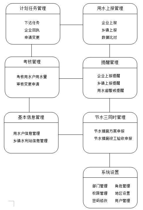 系統(tǒng)研發(fā)的主要內(nèi)容為計劃任務管理、用水上報管理、考核管理、提醒管理、節(jié)水三同時管理、基本信息管理、系統(tǒng)設置等模塊。